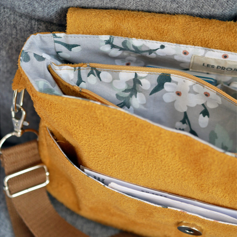 A noter : par défaut, le patron du rabat est proposé dans la version présentée sur les photos du sac en suédine moutarde : les 5 empiècements sont de taille régulière. Mais vous trouverez dans le téléchargement un fichier BONUS, correspondant au patron de ces empiècements dans la version du sac marron (cf photos) : l’empiècement central y est plus large.